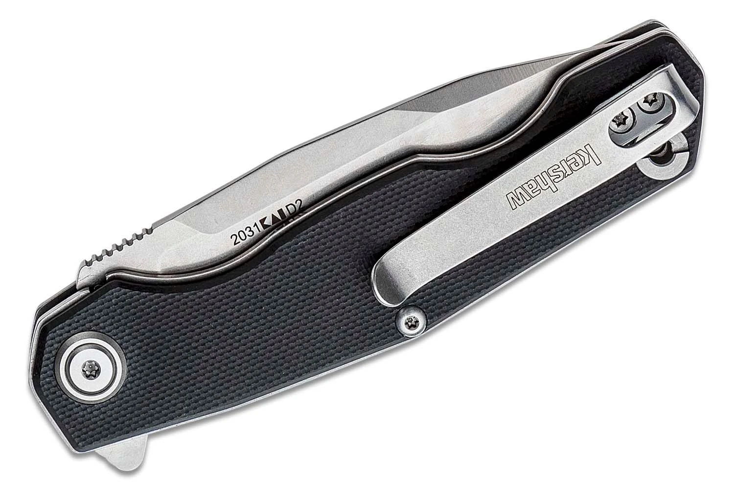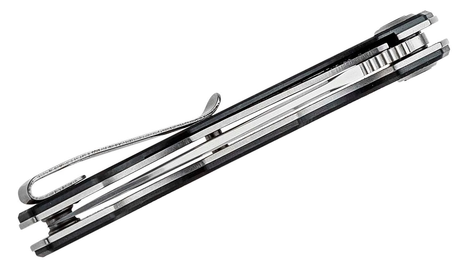 Die Klinge aus D2-Werkzeugstahl lässt sich mit einem Flipper öffnen und wird durch einen Linerlock-Verschluss in der offenen Position gehalten. Der strukturierte Griff ist aus dünnen G10-Klingen gefertigt. Am Ende des Griffs befindet sich ein Loch für ein Schlüsselband. Das Messer ist mit einem Clip zum Tragen in einer Tasche ausgestattet.