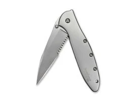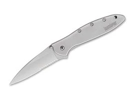 Kershaw Leek SerratedDas Kershaw Leek Serrated ist ein schlankes EDC Messer, das sich jeder Schneidaufgabe im Alltag annimmt. Seine Klinge aus hochleistungsfähigem Sandvik 14C28N öffnet federunterstützt wahlweise per Daumenpin oder Flipper und wird durch den soliden Frame-Lock im Edelstahl-Griff gehalten. Durch den Teilwellenschliff wird das Spektrum der Schneidarbeiten massiv erweitert. Der umkehrbare Deep-Carry-Clip (Tip-Up / Tip-Down) ermöglicht ein diskretes Tragen des Taschenmessers. Hergestellt in den USA.Technische DatenGesamtlänge: 17,9 cmKlingenlänge: 7,6 cmKlingenstärke: 2,3 mmGewicht: 82 GrammKlingenmaterial: 14C28NGriffmaterial: EdelstahlDesigner: Ken OnionVerschluss: FramelockÖffnungshilfe: FlipperÖffnungsmechanismus: FederunterstütztFarbe: SilberKlingenfarbe: Unbeschichtet